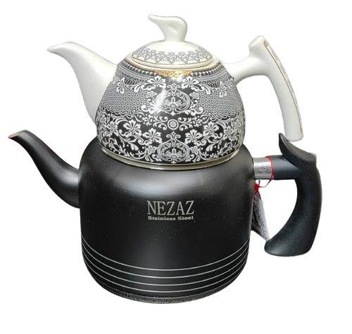 کتری قوری لوله دار نزاز مشکی کتری استیل بدنه رنگ کوره ای کتری 2.5 لیتری قوری چینی مشکی 1 لیتری کف چدن دسته رنگی باکالیت نسوز کتری دارای شبکه است که فنردارو دوحالته است کد 2406 محصول ایران با ضمانت