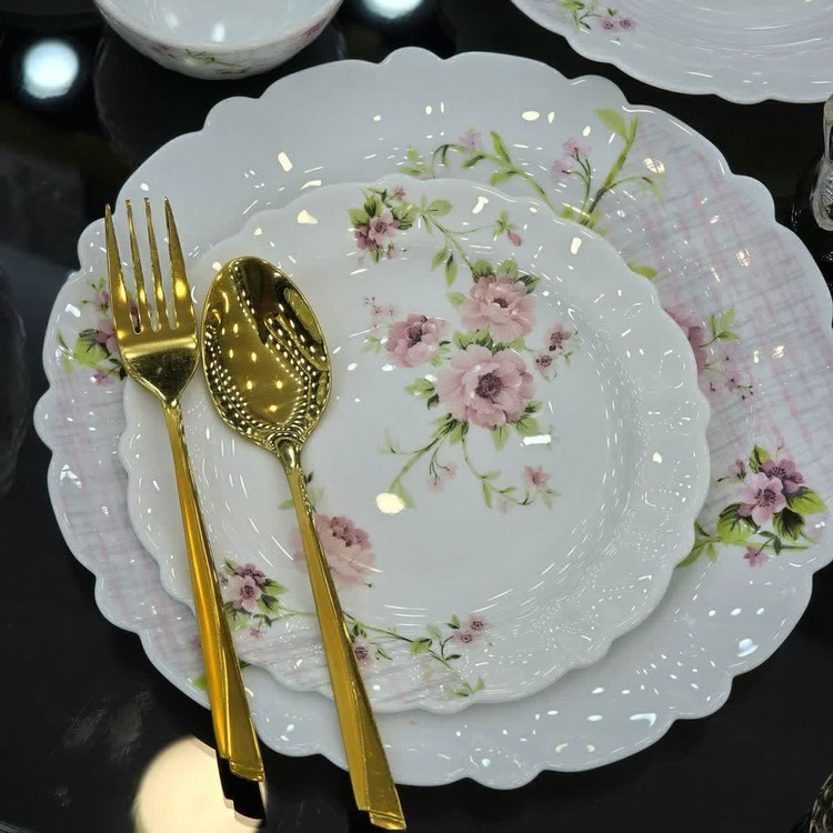 سرویس آرکوپال ۲۵ پارچه مدل سارا صورتی یک سرویس آرکوپال تولید ایران شرکت مقصود می باشد که با یک قالب جدید در طرح و نقشی بسیار زیبا و سبک تولید شده این ظروف قابلیت تحمل دمای بالایی را دارند به همین دلیل قابلیت قرارگیری در مایکروویو را دارا می باشند همچنین این ظروف قابلیت شستشو در ماشین ظرفشویی را نیز دارند این سرویس به صورت فله برای شما عزیزان تبدیل به سرویس خواهد شد که شامل: 6 عدد بشقاب تخت برنج خوری 6 عدد بشقاب گود خورش خوری 6 عدد پیش دستی دسر خوری 6 عدد پیاله ماست خوری 1 عدد دیس می باشد که در یک بسته بندی بسیار زیبا و با دوام قرار میگیرد