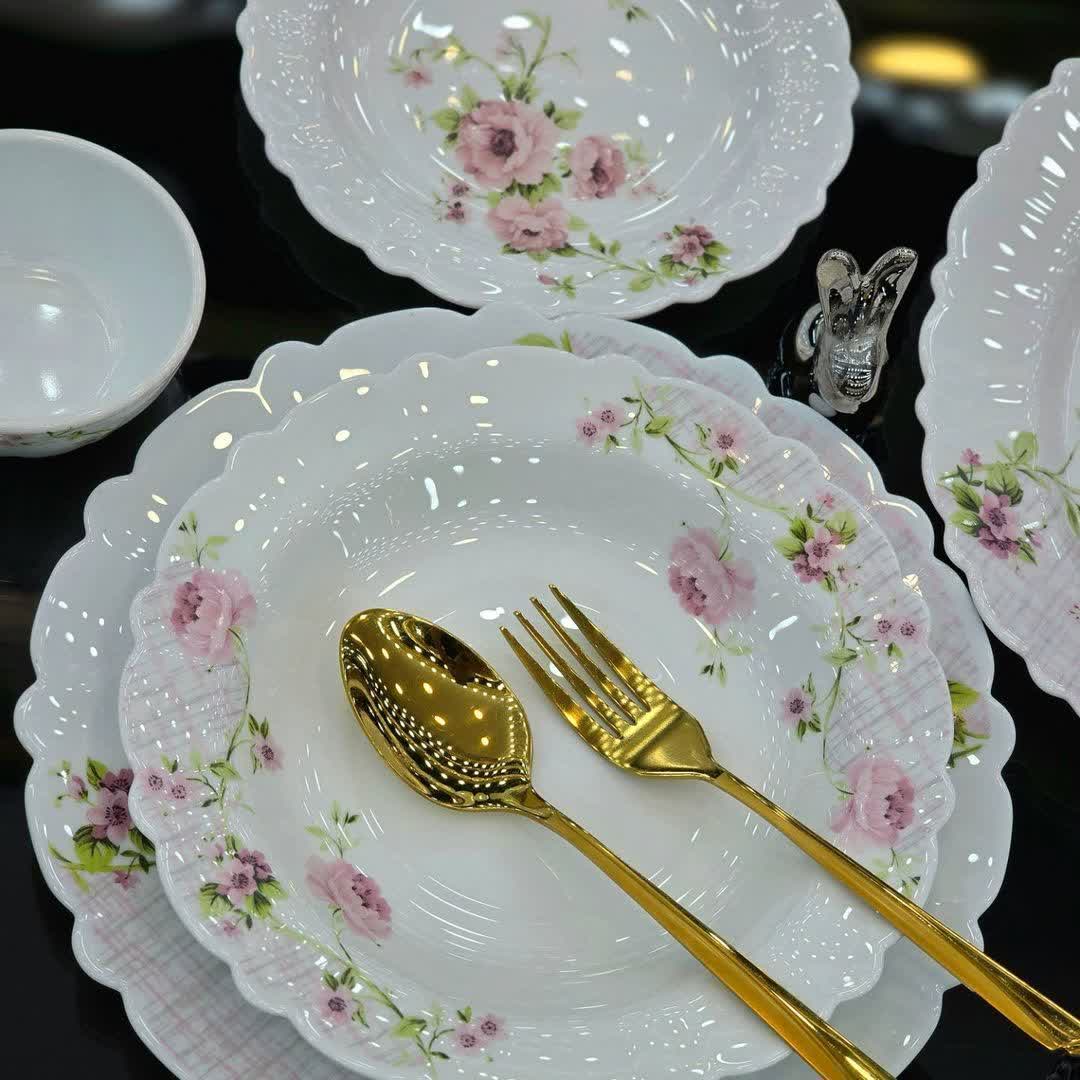سرویس آرکوپال ۲۵ پارچه مدل سارا صورتی یک سرویس آرکوپال تولید ایران شرکت مقصود می باشد که با یک قالب جدید در طرح و نقشی بسیار زیبا و سبک تولید شده این ظروف قابلیت تحمل دمای بالایی را دارند به همین دلیل قابلیت قرارگیری در مایکروویو را دارا می باشند همچنین این ظروف قابلیت شستشو در ماشین ظرفشویی را نیز دارند این سرویس به صورت فله برای شما عزیزان تبدیل به سرویس خواهد شد که شامل: 6 عدد بشقاب تخت برنج خوری 6 عدد بشقاب گود خورش خوری 6 عدد پیش دستی دسر خوری 6 عدد پیاله ماست خوری 1 عدد دیس می باشد که در یک بسته بندی بسیار زیبا و با دوام قرار میگیرد