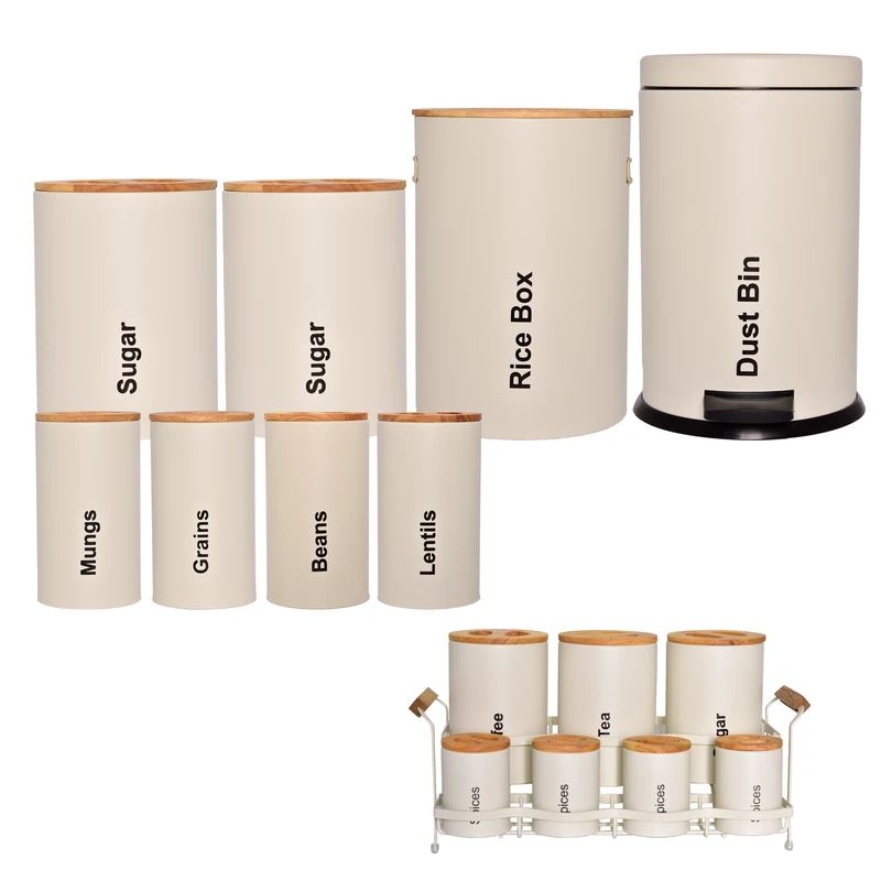 رنگ بدنه این سرویس ثابت است و در اثر استفاده مداوم و شستشو از بین نمی رود. این سرویس شامل سطل برنج، سطل زباله، بانکه قند و شکر، بانکه حبوبات پاسماوری و بانکه ادویه می باشد. این سرویس یک سرویس آشپزخانه کامل جهت نظم دهی به آشپزخانه می باشد. سطل زباله این سرویس آشپزخانه به صورت پدالی است و یک سطل پلاستیکی درب دار داخل آن است که قابلیت شستشو نیز دارد. بر روی بدنه این سرویس آشپزخانه اقلامی که در آن قابلیت نگهداری دارند مثل برنج، حبوبات، شکر، قهوه و چای نوشته شده است.