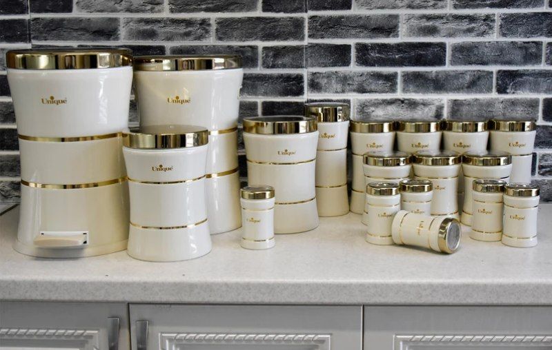 سرویس آشپزخانه 18 پارچه یونیک کرم درب طلا کد 4690 کمرباریک خطی